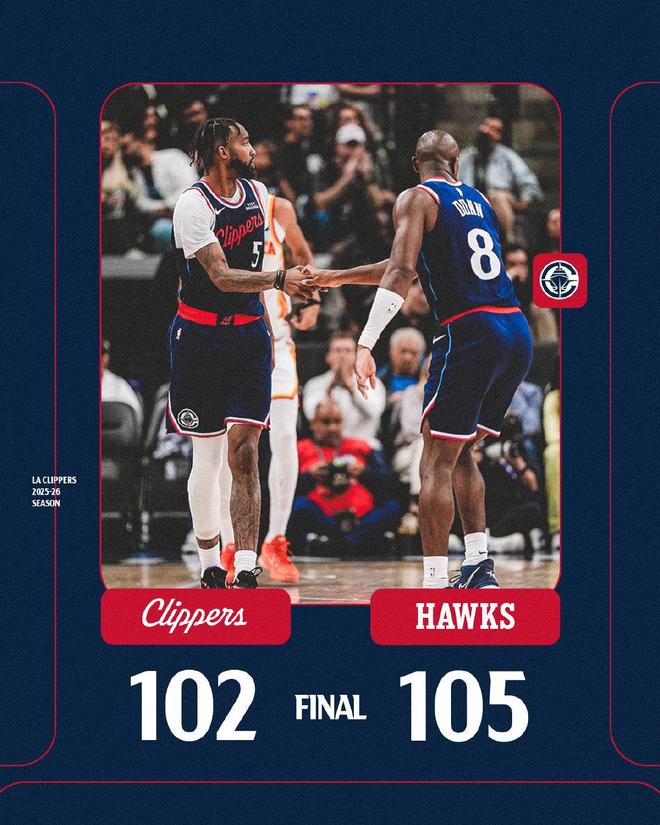 科林斯大帽波尔津吉斯,克雷伊奇命中打板远投,老鹰领先7分得以占据比赛主动权。哈登命中3+1,为快船续命。琼斯抢断,距离终场还剩15秒,哈登超远三分球不中,里萨谢2罚不中。哈登抢下篮板,巴图姆出手远投未果,比赛时间走完。最终,快船以102比105惜败老鹰,吞下了5连败。
